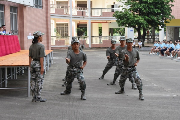 接著,全體教官向同學們展示精彩的示范表演。教官的動作整齊,姿勢標準,精神飽滿,體現(xiàn)了他們極高的軍事素養(yǎng),廣場上響起了同學們熱烈的掌聲。