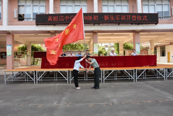 教官鄭康全隊長向同學們介紹了軍訓的意義,同時對同學們給予了幾點希望。隨后進行了授旗儀式,由黃圃鎮(zhèn)中學何彩霞校長向教官隊隊長鄭康全授予黃圃鎮(zhèn)中學校旗。