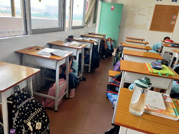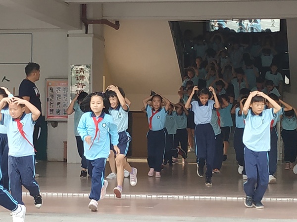 下午4時演練活動正式開始,演練主持通過廣播向全體師生講述本次演練的實(shí)際意義、注意事項及相關(guān)要求。隨后,通過廣播緊急通知學(xué)校發(fā)生地震,請全體師生緊急躲避。各師生立即抱頭躲避,直至廣播提示地震已經(jīng)停止才開始從課室往疏散點(diǎn)進(jìn)行撤離。此外,疏散引導(dǎo)組的老師在相應(yīng)樓梯口位置緊引導(dǎo)學(xué)生做好避險和疏散。全校師生順利集中到操場的疏散點(diǎn)后,各班以班級為單位集隊并立即清點(diǎn)人數(shù),將人數(shù)向黃健翼和陳海輝老師報告。最后,黃老師向陳子兵副校長匯報:本次演練應(yīng)到人數(shù)全部順利地疏散到安全地點(diǎn)。