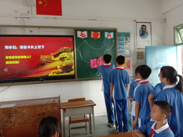 通過分享英雄故事,方老師引導同學們提煉出一個共同點:他們“熱愛人民,熱愛祖國,為人民謀幸福,為祖國謀發(fā)展”。有這么多的英雄為了我們現(xiàn)在的美好生活前仆后繼,不斷進取,不畏艱難困苦,奮勇拼搏!這也自然而然地升華了同學們的愛國情感,同學們紛紛覺得:作為中華人民共和國的一份子,生活在這樣一個越來越強大的祖國中,我們倍感驕傲、幸福與自豪!為了抒發(fā)同學們對祖國母親的愛,全班集體朗誦《我崇拜英雄》,并在卡紙上寫下自己將成為怎樣的人,如何實現(xiàn)?同學們都無限地感慨:我們要將自己的理想與中華民族偉大復興夢相結合,努力提升自身素質,豐富知識,開拓眼界,心懷民族,向英雄們看齊!