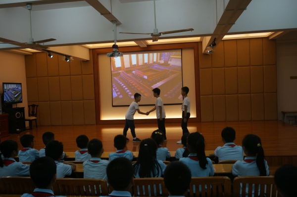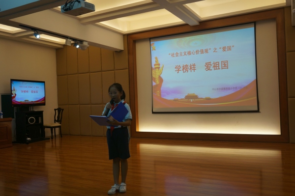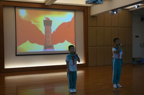 活動(dòng)在莊嚴(yán)的隊(duì)儀式后正式開(kāi)始。首先,主持人請(qǐng)各小隊(duì)的隊(duì)員上來(lái)分享他們?cè)谡n下收集的關(guān)于毛澤東主席和周恩來(lái)總理的事跡,通過(guò)視頻、小品和詩(shī)朗誦的方式,隊(duì)員們了解了這些偉大的領(lǐng)袖人物的事跡,繼而在全體隊(duì)員心目中樹(shù)立起榜樣。隊(duì)員在活動(dòng)中,還紛紛表示要向這些偉大的人物學(xué)習(xí)。接著,在了解了這些榜樣人物之后,隊(duì)員們還想到了,作為小小的少先隊(duì)員,沒(méi)有辦法像這些偉人和英雄一樣為祖國(guó)做貢獻(xiàn),但是可以從自己做起,從身邊的小事做起,愛(ài)祖國(guó),愛(ài)人民。于是,隊(duì)員們利用課余時(shí)間,排演了《當(dāng)國(guó)歌響起時(shí)》和《撿起國(guó)旗》兩個(gè)小品,告訴隊(duì)員們?nèi)绾巫鹬匚覀兊膰?guó)歌和國(guó)旗?隊(duì)員們深受啟發(fā),明白了這些身邊的小事都是我們隊(duì)員日常生活中可以做的愛(ài)國(guó)行為。接著,隊(duì)員們就在“小心心”貼紙上寫下了自己的愛(ài)國(guó)宣言,然后全體隊(duì)員把這些愛(ài)國(guó)宣言貼到了中國(guó)版圖的展板上,把內(nèi)在的愛(ài)國(guó)之情用實(shí)際的行動(dòng)展示出來(lái)。