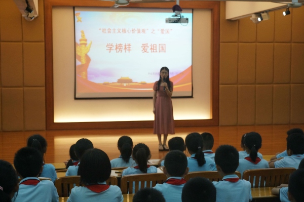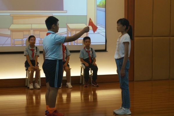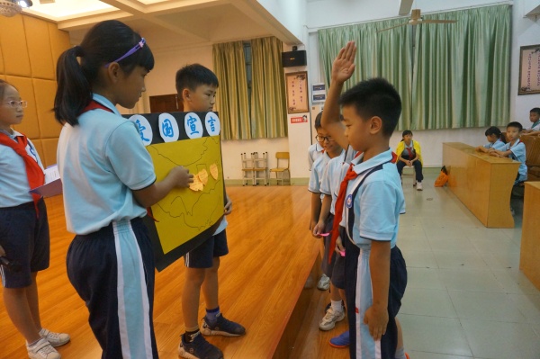 為積極響應(yīng)中山市教研室關(guān)于開(kāi)展中小學(xué)“愛(ài)國(guó)”德育主題班(隊(duì)團(tuán))課教學(xué)活動(dòng)的號(hào)召,中山市沙溪鎮(zhèn)虎遜小學(xué)四(2)中隊(duì)于2019年10月24日下午開(kāi)展了以“社會(huì)主義核心價(jià)值觀”之“愛(ài)國(guó)”——學(xué)榜樣,愛(ài)祖國(guó)為主題的隊(duì)課。在何溥彥輔導(dǎo)員的指導(dǎo)下,四(2)中隊(duì)的隊(duì)員們分小組籌劃了這次的中隊(duì)活動(dòng)。當(dāng)天下午,黃金奇校長(zhǎng)還召集全校的青年輔導(dǎo)員來(lái)參加了此次四(2)中隊(duì)的隊(duì)活動(dòng)。