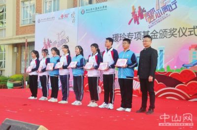 中山市工貿(mào)技工學(xué)校璦玲基金頒獎(jiǎng)現(xiàn)場(chǎng)。圖為陳彥杏(右一)為優(yōu)秀學(xué)子頒發(fā)獎(jiǎng)學(xué)金。