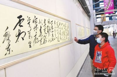 1月1日上午,由市文化廣電旅游局主辦的“新的征程——黑子、陽(yáng)子毛體書風(fēng)中山展”在中山美術(shù)館拉開序幕,展覽將持續(xù)至1月5日,市民可免費(fèi)觀展。市委常委、宣傳部部長(zhǎng)林銳熙出席開幕儀式。圖為家長(zhǎng)向孩子講解書法中的含義。