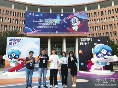 中山職院學(xué)生參加第六屆中國國際“互聯(lián)網(wǎng)+”大學(xué)生創(chuàng)新創(chuàng)業(yè)大賽總決賽時留影,左二為指導(dǎo)老師馬鵬常。 受訪者 供圖