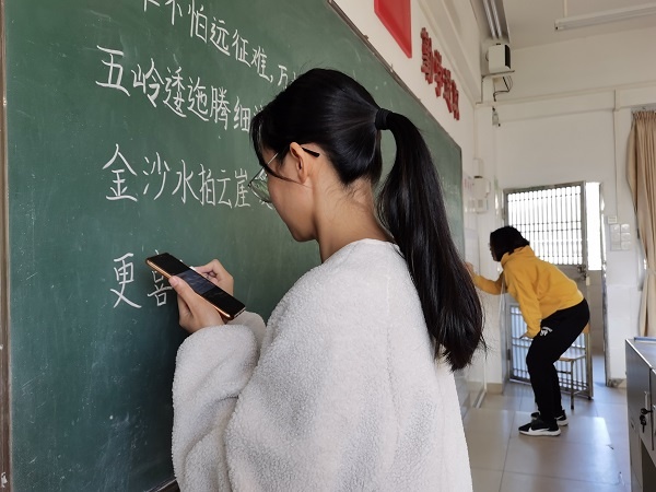 比賽書寫內(nèi)容由教務(wù)處提供。比賽過程中,老師們認(rèn)真構(gòu)思,精心書寫,盡力發(fā)揮自己的最好水平。在硬筆字的比賽現(xiàn)場(chǎng),老師們?nèi)硇牡赝度氲綍鴮懏?dāng)中,書寫的內(nèi)容是《念奴嬌.赤壁懷古》,大家一絲不茍,字跡工整美觀,著力表現(xiàn)詩中的磅礴氣勢(shì);在粉筆字比賽現(xiàn)場(chǎng),老師們采用“站立懸臂”的姿勢(shì)書寫著《七律.長(zhǎng)征》,筆畫或方或圓、或粗或細(xì),有的剛健清新,有的遒勁有力,盡情展示自己的風(fēng)采;在毛筆字的比賽現(xiàn)場(chǎng),老師們有的端坐,有的站立,揮豪潑墨,風(fēng)格各異,有的輕松飄逸,有的干勁凝重。在三個(gè)小時(shí)的緊張角逐中,一幅幅或清新飄逸或蒼勁有力的作品展現(xiàn)在眼前。