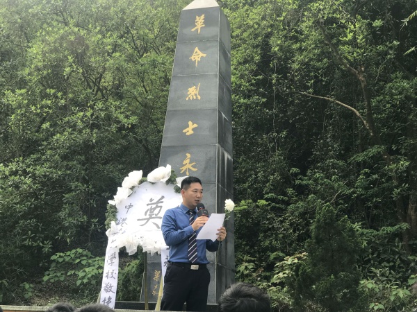 活動現(xiàn)場,在校團支部書記劉穎老師的帶領(lǐng)下,四名學(xué)生代表向烈士墓敬獻(xiàn)花圈,以表達(dá)他們對革命先烈的崇敬和懷念之情。在莊嚴(yán)肅穆的氣氛中,全體師生在革命烈士紀(jì)念碑前整齊列隊,全體人員低頭默哀一分鐘,以示對烈士最崇高的敬意。五桂山學(xué)校周慶基老校長向同學(xué)們介紹了當(dāng)?shù)丶o(jì)念碑的由來以及“五·九”反掃蕩戰(zhàn)斗中革命先烈的英雄事跡。F.5D林校綺同學(xué)作為學(xué)生團員代表發(fā)言。她表示要學(xué)習(xí)革命先烈的精神,繼承先烈的遺志,發(fā)揚光榮的革命傳統(tǒng),規(guī)范自己的言行,嚴(yán)格要求自己,好好學(xué)習(xí),為振興中華,建設(shè)強大的祖國而努力,以告慰烈士忠魂。