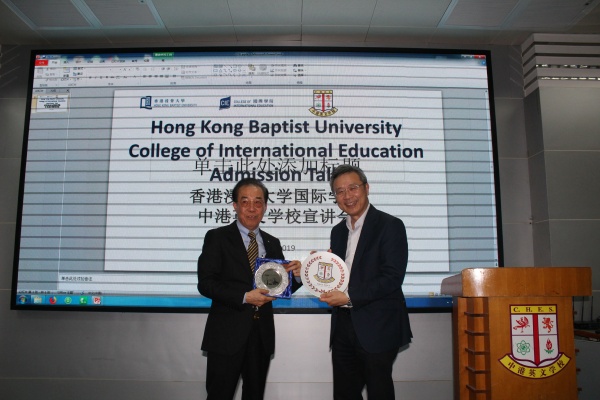 當(dāng)日下午,在蔡國贊博士、劉朝榮校長等校領(lǐng)導(dǎo)以及中港學(xué)生大使的陪同下,鐘志杰院長一行首先參觀了中港校園。接下來,在校資訊室舉行的香港浸會大學(xué)國際學(xué)院宣講會上,校董事長蔡國贊博士代表學(xué)校對鐘志杰院長等領(lǐng)導(dǎo)的到來表示歡迎,對香港浸會大學(xué)長期以來對中港學(xué)子的關(guān)心、支持和幫助表示感謝。鐘志杰院長稱贊中港始終與國際先進(jìn)教學(xué)理念保持同步,堅持不懈推進(jìn)國際交流,并對學(xué)校致力于培養(yǎng)具有國際競爭力人才的辦學(xué)理念、豐富精彩的校園文化以及豐碩的教育成果給予了高度認(rèn)可與評價,同時歡迎更多的中港學(xué)子選擇香港繼續(xù)完成自己的求學(xué)理想。最后,香港浸會大學(xué)國際學(xué)院副總監(jiān)林非恩博士詳細(xì)介紹了香港浸會大學(xué)國際學(xué)院的相關(guān)資訊與錄取條件,部分家長與F.6全體同學(xué)參與了此次宣講會。