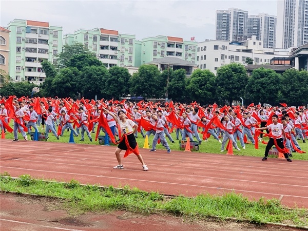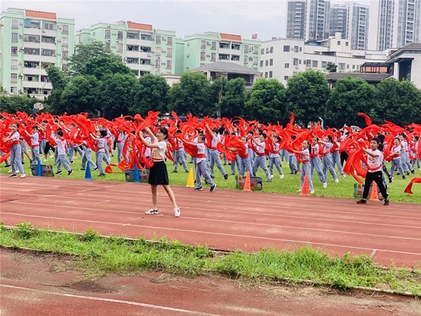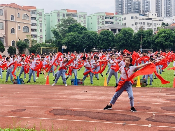為了讓學(xué)生們進(jìn)一步地了解感受水滸人物的獨(dú)特魅力,增強(qiáng)自身身體素質(zhì),北區(qū)小學(xué)經(jīng)過研究討論,用《好漢歌》編排了一套活力滿滿,動(dòng)感十足的校本操,搭配著節(jié)奏感非常強(qiáng)烈的歌曲,學(xué)生跳起來動(dòng)感、精神。在動(dòng)感、豪爽的步子中舞起腰間的紅綢帶,顫步晃頭,扭腰抖肩。整體動(dòng)作爽朗風(fēng)趣、活潑大方。搭配上熱情豪邁的《好漢歌》,既能感受到水滸英雄的疏朗豪情,又能很好地鍛煉身體,每日大課間鈴聲響起時(shí),他們便會(huì)迫不及待地拿出屬于自己的紅綢帶,迅速地排好隊(duì)集中在操場(chǎng)上,跟隨著彭靜老師的口令學(xué)習(xí)集體舞動(dòng)作。驕陽如火,孩子們手中的紅綢舞動(dòng)起來,連成一片紅色的海洋。