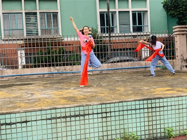 每個(gè)孩子的臉上都洋溢著燦爛的笑容,高年級(jí)的小朋友們學(xué)得快一些,動(dòng)作有模有樣,踩著鼓點(diǎn)變化著腳步,揚(yáng)起紅綢;低年級(jí)的弟弟妹妹們學(xué)得稍微慢一些,但跟著哥哥姐姐們搖擺著小手,跺著小腳,也是活力四射,精神滿滿。通過動(dòng)感的音樂、豪邁的舞蹈動(dòng)作,在舞蹈的過程中學(xué)生的全身心都沉浸在英雄好漢的豪邁情懷中,心中那份因疫情而沉寂的心情一下子被趕到九霄云外,因疫情而產(chǎn)生的小情緒都被動(dòng)感的節(jié)奏所感染,孩子們個(gè)個(gè)都笑起來、跳起來、舞起來!
