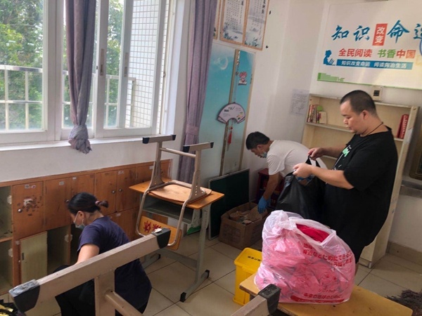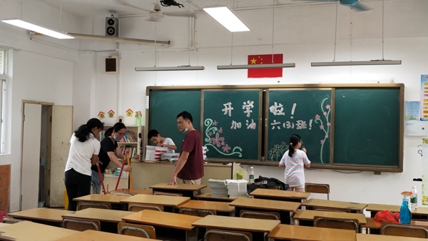 清潔完教室,老師們帶著親子義工前往學(xué)校圖書館領(lǐng)取書籍。老師們將書籍歸置好后,家長(zhǎng)們和孩子接力將圖書館的書籍搬回教室,進(jìn)行書籍分類,并將書籍分發(fā)到每位同學(xué)的桌上,細(xì)心地整理......很快,一摞摞整齊的書籍平整地放在干凈的桌面上,等待著同學(xué)們的歸來。不知不覺已經(jīng)過去了一個(gè)多小時(shí),教室外陽光熾熱,教室里熱情洋溢, 一張張勞動(dòng)中的臉紅撲撲的,伴著笑容在校園里格外美麗。