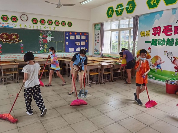 清潔活動(dòng)開始了,校園里,校道上,教室里,走廊上到處都是義工們忙碌的身影,他們有的打掃教室,有的提著水桶等待打水,有的搬著桌椅......天氣雖然炎熱,但阻擋不了親子義工隊(duì)的熱情,他們?cè)诿β抵杏姓f有笑,露出一張張滿意的笑臉。