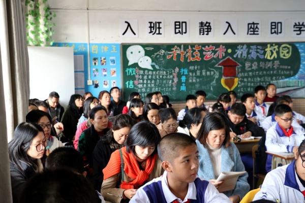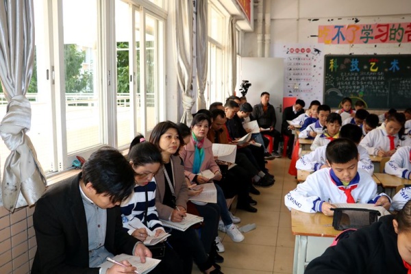 9:20,老師和家長們來到課堂聽課。講臺前,老師們各顯其能,有的神采風(fēng)揚(yáng),激情澎湃;有的親切自然,循循善誘;有的詼諧幽默,情趣盎然……同學(xué)們更是專心聽講,發(fā)言踴躍,認(rèn)真討論……師生互動,教學(xué)相長,笑聲不斷,掌聲不斷!聽課的老師、家長們則擠坐在教室后面,有的干脆就站在教室外面,他們個個全神貫注,時而低頭做筆記,時而點頭微笑,時而鼓掌叫好……
