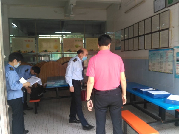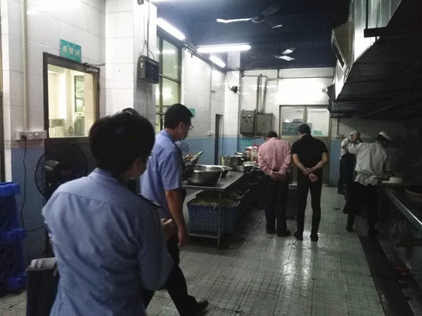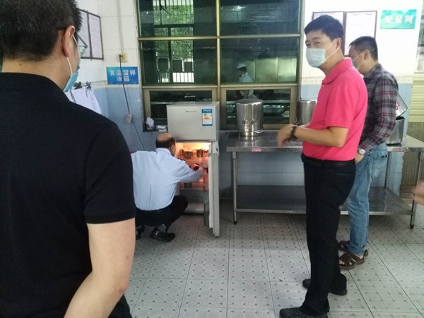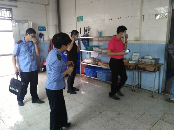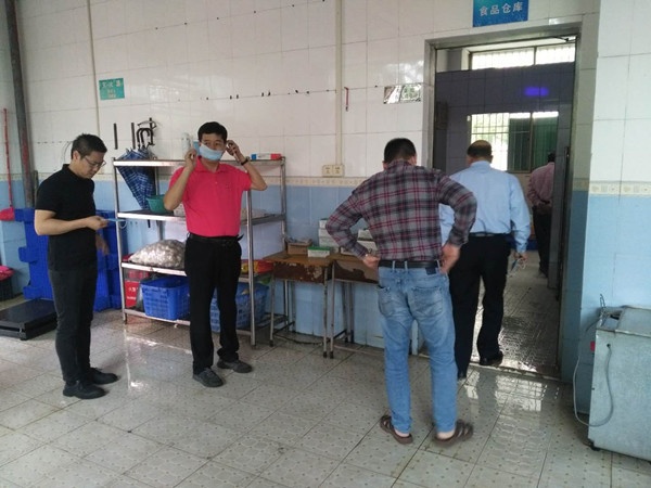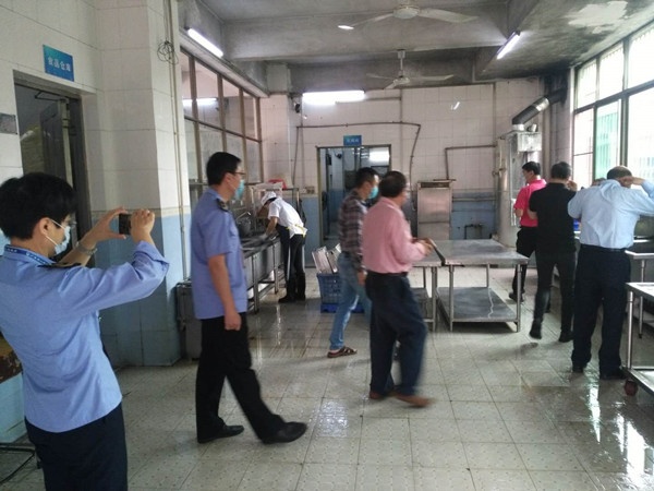 本次飛行檢查主要主要檢查了學校飯?zhí)迷牧系牟少彙⒐痰乃髯C索票、各專間的管理、食品的留樣,相關制度的公示,資料的歸檔等情況。檢查組成員認真地檢查各功能間的衛(wèi)生以及防護措施,制作流程和留樣質量等工作,最后一致肯定了東陽學校食品安全工作落實到位,責任到人,各細節(jié)工作布置得妥當,飯?zhí)玫牧魳?,制作流程都能按要求保質保量。并給了幾點建議:烹調(diào)間荷臺上用瓦缽盛裝的各種用于烹調(diào)的佐料要對應標明相關物品的標簽;預進間的洗手池要徹底清洗干凈;粗加工間和備餐間的紗窗門,要安裝彈簧,能夠讓此門自動閉合;食品留樣冰箱里的留樣,容器上面的標簽日期要精確。并提醒采購人員要提高警惕,物品來源一定要索證索票,要與正規(guī)貨商簽訂相應的合同,所有的有葉蔬菜、無葉瓜果都要進行藥檢,預防萬一;飯?zhí)貌糠衷O備要求更新、維修。檢查組田醫(yī)生也提醒,要老師們對學生進行毒蘑菇預防教育工作,學校食品安全要嚴把關,留樣、制作流程要相關人員跟進。教育事務指導中心黃校長強調(diào):食堂主管人員、食品衛(wèi)生監(jiān)督員在食品安全上一定要打起十二分精神,不得馬虎,不得掉以輕心,堅決杜絕一切安全事故的發(fā)生。