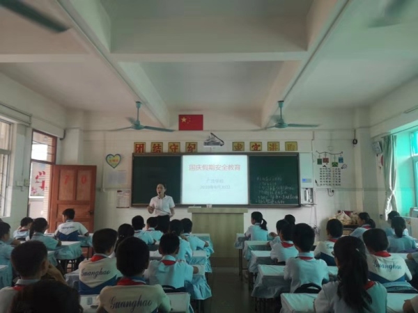為貫徹落實“十一”長假期間學(xué)校對于學(xué)生安全教育及管理工作方面的要求,確保廣浩學(xué)校學(xué)生能夠提高自我防護(hù)意識,度過一個安全愉快的假期。9月30日,廣浩學(xué)校德育處組織全體師生開展國慶節(jié)放假安全教育主題班會。