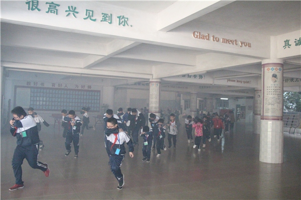 8點55分,校園內(nèi)響起消防警報聲,全校3000多名師生在安全引導(dǎo)員的組織下,從教室前后門分別快速、在走廊集隊,并按計劃分班級迅速下樓梯到操場集合。在隊伍行進中,同學(xué)們都能把老師傳授的逃生知識應(yīng)用到演練中,彎腰、低頭、捂鼻等動作都做得非常規(guī)范到位。本次演練使用了消防專用煙霧彈,逃生現(xiàn)場出現(xiàn)了大量黃色煙霧,增加了逼真的火災(zāi)情形。7分鐘后,全校師生都安全到達操場的指定位置。在預(yù)定的時間內(nèi)完成了逃生演習(xí),速度較快,隊形隊列整齊劃一,逃生時的身體姿勢規(guī)范到位,各班級輔導(dǎo)員老師指揮得力。到達操場后,同學(xué)們雙手護頭蹲下,安靜的等候指令。