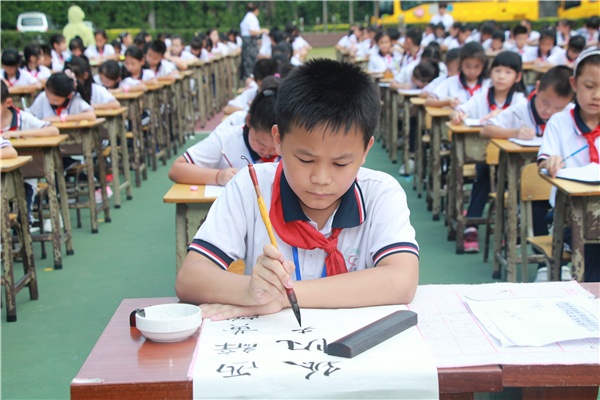 為慶祝新中國成立70周年,弘揚(yáng)中華民族傳統(tǒng)文化,豐富校園文化生活,促使學(xué)生養(yǎng)成規(guī)范書寫漢字的習(xí)慣。10月25日下午,中山市新長江學(xué)校舉行了“第四屆書法現(xiàn)場大賽”,來自二至九年級近500名學(xué)生齊聚學(xué)校運(yùn)動場,一展才藝。