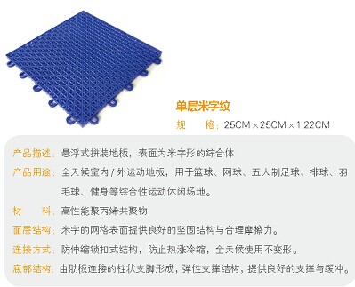 與硬質(zhì)地面相比,拼裝地板具有良好的安全性、減震性和反彈力,很好地實(shí)現(xiàn)垂直吸震及能量回送,側(cè)向緩沖,防滑,防運(yùn)動(dòng)損傷,有效保護(hù)運(yùn)動(dòng)者的運(yùn)動(dòng)安全,充分發(fā)揮人體運(yùn)動(dòng)潛能。采用原料聚丙?。≒P)為高強(qiáng)度材料,無毒環(huán)保。