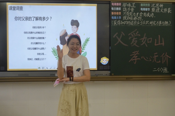 6月19日 上午,各班舉行“父愛如山 孝心無價”主題班會,讓同學(xué)們了解父親節(jié)的由來,交流父愛在日常生活中的體現(xiàn)。一組組溫馨的圖片、歌曲、短片讓同學(xué)們回憶起和爸爸在一起的美好時光。一首歌,一支曲,都是我愛您!課堂上,他們大聲唱響《父親》這首屬于爸爸的歌,還為爸爸們帶來了《爸爸最好了》的手語操表演。