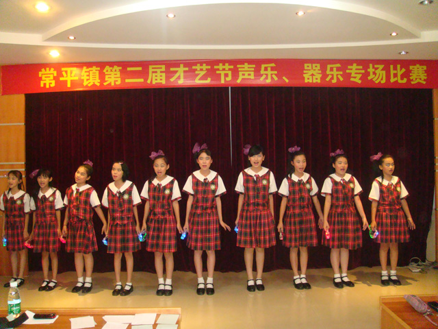 ??? 常平第二小學是由原白石崗、田尾、沙湖口、白花瀝、松柏塘小學合并而成的,現(xiàn)有學生900多人。2008年,在上級主管領導的關(guān)心下,學校把“童聲合唱”作為藝術(shù)教育的特色項目,在當時全校400多個孩子中選拔出50多位嗓音、樂感較好的學生進行合唱訓練,由本校音樂教師林?B擔任訓練指揮。
