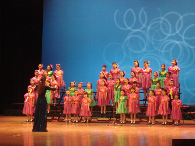 ??? 合唱隊終于成立了,接下來要做的就是怎樣進行訓練的問題,剛接觸合唱訓練,很多孩子都還不明所以。第一次的訓練課,老師請同學們唱剛學會的《茉莉花》,結(jié)果,聽到的并不是甜美、柔和、有穿透力的清亮童聲,而是稀里嘩啦的一堆噪音,孩子們覺得唱的大聲就是好聽,因而爭先恐后地大聲喊唱。有了這次的訓練經(jīng)歷,負責訓練的老師轉(zhuǎn)變了排練的思路和方法,要讓孩子們唱出美妙的聲音,樹立他們正確的聲音概念才是最主要的,于是,老師在每一次的排練之前都用20分鐘讓孩子們欣賞一些世界優(yōu)秀的童聲合唱團演唱的作品,讓他們知道并不是唱的大聲就是好的,經(jīng)過一段時間的熏陶,聰明的學生們對聲音的概念有了質(zhì)的改變,合唱隊進入了正式的全面訓練階段。