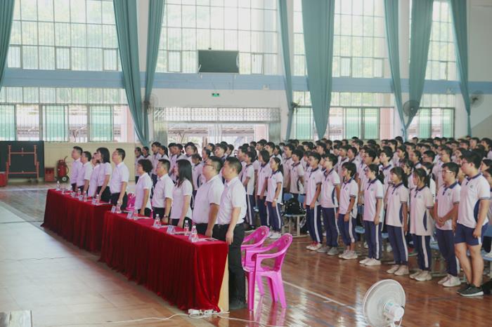 伴隨著雄壯的國(guó)歌聲響起,九年級(jí)畢業(yè)典禮拉開了序幕。全體起立,奏唱國(guó)歌。