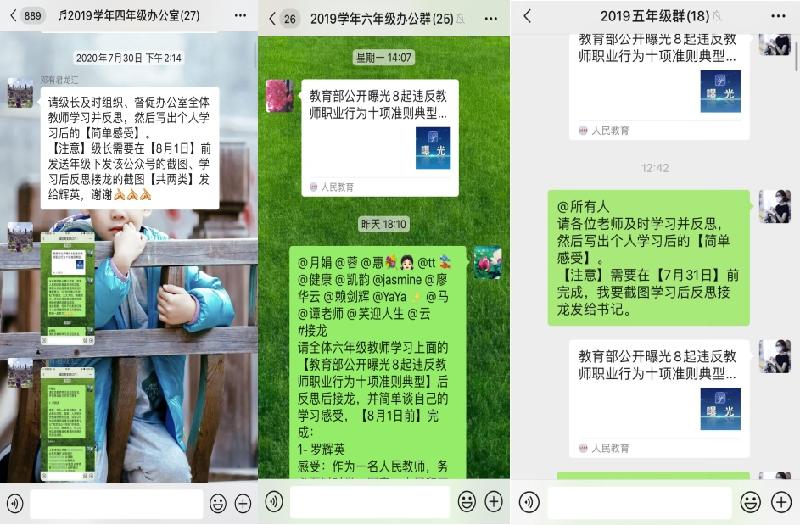 “師者,以德為先”。高尚的師德師風(fēng)是教師從事教育工作的靈魂。為了進(jìn)一步加強(qiáng)教師隊伍建設(shè),不斷提高教師職業(yè)道德素質(zhì)和師德修養(yǎng),保障全體教師在良好師德師風(fēng)塑造和學(xué)習(xí)中的不松懈和持續(xù)性,7月27日-30日,在暑假期間,龍江城區(qū)中心小學(xué)組織全體教師在線上重點學(xué)習(xí)了“教育部公開曝光8起違反教師職業(yè)行為十項準(zhǔn)則典型問題”一文,并進(jìn)行了自我反思和學(xué)習(xí)心得的分享交流。