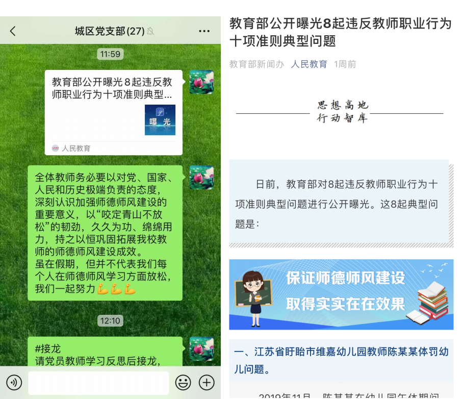 “師者,以德為先”。高尚的師德師風(fēng)是教師從事教育工作的靈魂。為了進(jìn)一步加強(qiáng)教師隊(duì)伍建設(shè),不斷提高教師職業(yè)道德素質(zhì)和師德修養(yǎng),保障全體教師在良好師德師風(fēng)塑造和學(xué)習(xí)中的不松懈和持續(xù)性,7月27日-30日,在暑假期間,龍江城區(qū)中心小學(xué)組織全體教師在線上重點(diǎn)學(xué)習(xí)了“教育部公開(kāi)曝光8起違反教師職業(yè)行為十項(xiàng)準(zhǔn)則典型問(wèn)題”一文,并進(jìn)行了自我反思和學(xué)習(xí)心得的分享交流。