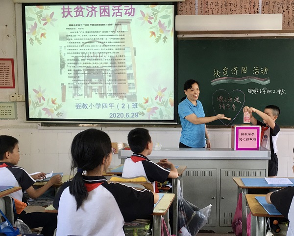 2020年6月28日,弼教小學(xué)大隊(duì)輔導(dǎo)員張敏靈在校園廣播及微信公號(hào)向全校師生發(fā)出倡議:伸出您的援助之手,奉獻(xiàn)您的一份愛心,送上您的一份真情,貢獻(xiàn)您的一份力量,點(diǎn)燃貧困家庭的一份希望,讓那些在困難中的人們感受到溫暖,得到幫助,早日擺脫困境,過(guò)上幸福的生活。倡議發(fā)出后,弼教小學(xué)師生踴躍參與,奉獻(xiàn)愛心。