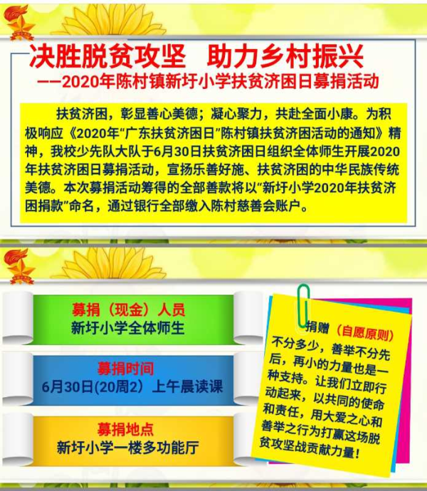 愛心傳遞,情暖校園,眾人拾柴火焰高,愛心奉獻(xiàn)暖人心。2020年6月30日早上,在新圩小學(xué)多功能室舉行以“決勝脫貧攻堅,助力鄉(xiāng)村振興”為主題的“2020年新圩小學(xué)扶貧濟(jì)困日”募捐活動。此活動在新圩小學(xué)大隊部的倡議下,得到全體師生的積極參與,愛心捐助,奉獻(xiàn)一份愛心,給予一份微薄之力,同心助力鄉(xiāng)村建設(shè)與發(fā)展。