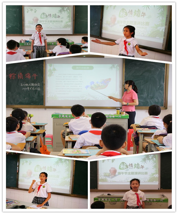 6月29日班會(huì)課各班舉行了一次有關(guān)端午節(jié)的主題班會(huì)。班會(huì)上,老師和同學(xué)們通過講端午節(jié)的習(xí)俗和歷史故事、PPT課件展示等多種形式,讓學(xué)生了解端午節(jié)的來歷、習(xí)俗,體會(huì)我國傳統(tǒng)節(jié)日獨(dú)特魅力,激發(fā)孩子的愛國情感。各班還開展了有關(guān)端午的演講比賽,既陶冶了學(xué)生的情操,弘揚(yáng)了中華民族優(yōu)秀傳統(tǒng)文化,又培養(yǎng)了學(xué)生的愛國主義情懷。