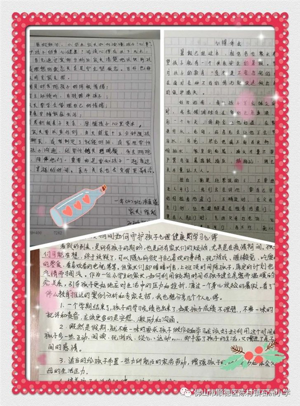 班主任們根據(jù)佛山市守護(hù)師生身心健康項(xiàng)目推送的小學(xué)系列專業(yè)宣傳推文,及時(shí)為家長送上最新鮮的資訊,指導(dǎo)家長履行職責(zé),暑假期間守護(hù)孩子的心理健康。家長們通過學(xué)習(xí)推文中的“案例呈現(xiàn)”、“案例解剖”、“專家支招”等內(nèi)容,為孩子營造溫馨祥和的家庭氛圍,有效地培養(yǎng)孩子的積極情緒,建立和諧的親子關(guān)系。