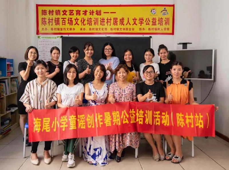 第一場(chǎng)由海尾小學(xué)陳翠校長(zhǎng)主講。陳校長(zhǎng)把海尾小學(xué)“美食+童謠”校本課程當(dāng)中對(duì)童謠創(chuàng)作所進(jìn)行的一系列研究成果帶到陳村,向現(xiàn)場(chǎng)來(lái)自陳村鎮(zhèn)不同領(lǐng)域的一眾學(xué)員進(jìn)行毫無(wú)保留的講解,傳授童謠創(chuàng)作的技巧。從童謠的歷史起源、分類、特點(diǎn)到藝術(shù)形式,陳校長(zhǎng)帶著學(xué)員們從遠(yuǎn)古走到現(xiàn)代,配以生動(dòng)的童謠視頻,剖析童謠的趣味、內(nèi)涵以及創(chuàng)作手法。
