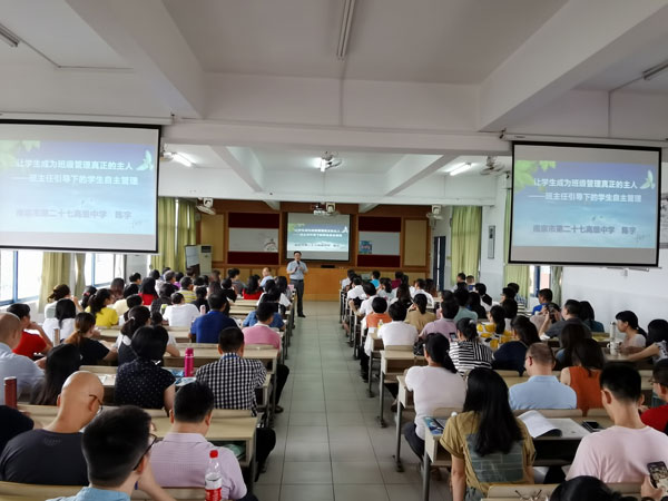 暑去秋來,學期伊始;使命催征,時不我待。為進一步貫徹2020年陳村鎮(zhèn)教育高質量發(fā)展座談會的精神,同時為了培養(yǎng)教師的德育素養(yǎng),獲取多元化的教育途徑,了解德育新動態(tài),全面提升教師的育德水平和創(chuàng)新能力,打造一流的師資隊伍,2020年8月31日陳村鎮(zhèn)初級中學邀請南京市第二十七高級中學陳宇老師為全校教師做了題為“讓學生成為班級管理真正的主人――班主任引導下的學生自主管理”的培訓講座。