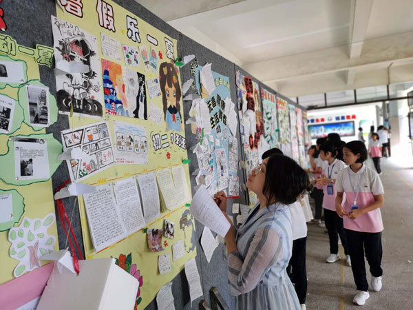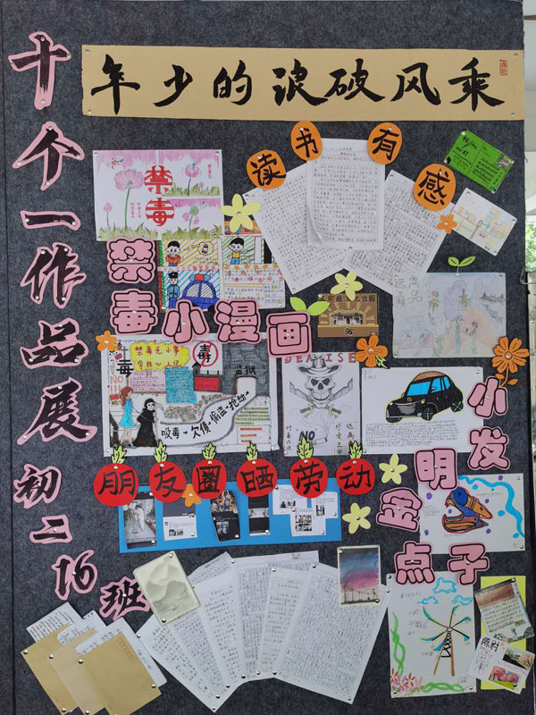 本次暑假 “十個一”作品展示活動項目有:1、“書信立志 不負韶華”。2、“小小發(fā)明家”。3、“愛祖國,誦經(jīng)典”――中華傳統(tǒng)文化經(jīng)典誦讀。4、“疫情當下――我可以做的是 ”征文活動。5、“勞動一夏”。6、“走出校園,體驗社會”實踐調(diào)查。7、“禁毒無小事,常掛心上記”漫畫作品。8、“印象陳村”明信片制作。記錄陳村鎮(zhèn)情,感受陳村發(fā)展。9、“陳村色彩”主題攝影。10、讀一本好書,創(chuàng)書香校園。本次暑假“十個一”活動形式多樣,內(nèi)容豐富,給同學們提供了一個鍛煉與展示的平臺,得到了同學們的積極響應。課間期間,初一、初二級的同學們有序地參觀了暑假“十個一”作品展覽。濃墨重彩的書畫作品,心靈手巧的手工佳作,精心排版的板報,讓同學們大開眼界,情不自禁地發(fā)出陣陣贊嘆。每年的暑假“十個一”作品,同學們都能夠別出心裁,充分發(fā)揮豐富的想象力和創(chuàng)造力,用心血凝聚成勞動的成果。