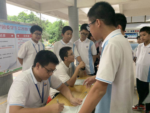 本次學(xué)生會招新工作通過廣播、班會課、海報宣傳等方式,從海選,競選演講,到確認(rèn)新任學(xué)生會干部名單并發(fā)表就職演說,共歷時一個月。這次陳村鎮(zhèn)初級中學(xué)學(xué)生會招募以下七個部的學(xué)生會干部成員:禮儀部、生活部、宣傳部、記者部、國旗班、禮儀隊、鼓樂隊。競選及入會辦法是參選學(xué)生首先到班主任、班長處領(lǐng)表填寫,并交班主任和級長審批,同意后可以參加初賽。競選方式是承繼上年傳統(tǒng)招聘形式,即人才交流市場式招聘,讓學(xué)生提前融入社會的招聘網(wǎng),感受競爭的激烈,從而更好激發(fā)學(xué)生努力學(xué)習(xí),不甘落后的斗志。具體內(nèi)容有自我介紹(不能讀稿)和現(xiàn)場答辯。競選過程中,同學(xué)們認(rèn)真準(zhǔn)備,躊躇滿志,充滿信心地介紹自己,滿懷激情地發(fā)表自己當(dāng)選后的規(guī)劃,頗有仁者見仁,智者見智的范兒,將自己的能力展示得淋漓盡致。經(jīng)過層層角逐,一批優(yōu)秀學(xué)生脫穎而出,成為新一屆團委學(xué)生會的骨干。