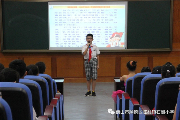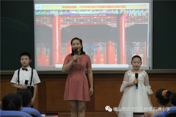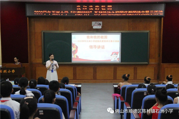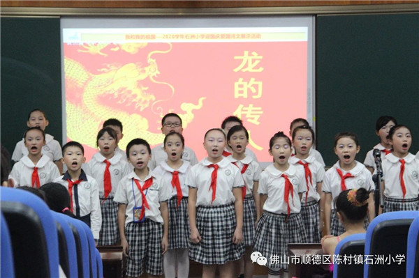 2020年9月28日下午,石洲小學(xué)電教室主會(huì)場(chǎng)、各班分會(huì)場(chǎng)上的陽光少年們愛國熱情高漲,歌舞《我和我的祖國》拉開了本次活動(dòng)的帷幕。緊接下來的節(jié)目形式多樣,豐富多彩。詩歌朗誦《我驕傲 我是中國人》、《中華頌》慷慨激昂,把對(duì)祖國的贊美與熱愛表現(xiàn)得淋漓盡致?!吨戮匆痪€抗疫英雄》,感人至深,聽者無不感動(dòng)于“逆行者”抗疫精神的偉大。一曲《龍的傳人》那稚嫩的聲音,純真的笑容,愛國的情懷贏得了在場(chǎng)所有觀眾的陣陣掌聲……隨后,何培雯副主任對(duì)本次活動(dòng)進(jìn)行了小結(jié),贊揚(yáng)了各年級(jí)組、各班級(jí)展現(xiàn)了石洲小學(xué)陽光少年們積極向上,奮發(fā)進(jìn)取的精神面貌。經(jīng)過激烈的角逐最后《國家》榮獲最佳表演獎(jiǎng)、《我和我的祖國》榮獲最佳創(chuàng)意獎(jiǎng)、《龍的傳人》榮獲陽光風(fēng)采獎(jiǎng)等各項(xiàng)獎(jiǎng)項(xiàng)。