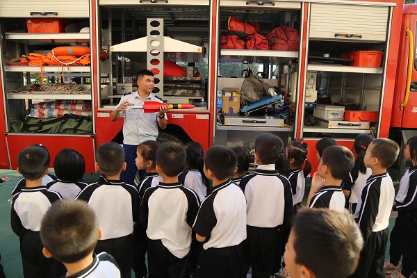 消防安全教育班會課 潭小師生參加消防逃生演練 潭小學子一馬當先 潭小學子參觀消防車并認真聆聽消防官兵的講解