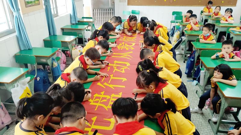 全校同學(xué)在“光盤行動,從我做起”的橫幅上鄭重地簽名,承諾要節(jié)儉,不浪費。
