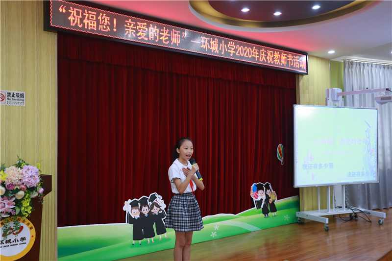 在這特別值得紀(jì)念的日子里,學(xué)生代表――何韻瑩同學(xué)在多媒體室現(xiàn)場帶領(lǐng)同學(xué)們一起把《感恩的心》送給親愛的老師們。稚嫩的聲音傳遞著孩子們心中的真情,千言萬語匯成一句話:老師,您辛苦了!