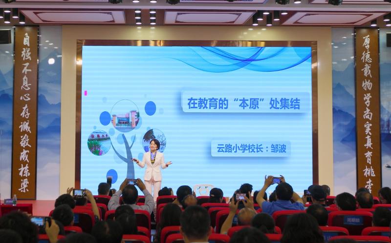 鄒波校長以大方從容的姿態(tài),運(yùn)用語言的表現(xiàn)力、聲音的感染力、張弛有度的態(tài)勢語言去觸動(dòng)每一位觀眾。她從一所成員校的視角,以時(shí)間軸來向大家講述本原集團(tuán)發(fā)展的三步曲:借鑒植入、融合創(chuàng)新、新生蛻變。鄒校長從第一階段制度共建、理念共享、氛圍共創(chuàng),第二階段管理同步、研訓(xùn)同進(jìn)、活動(dòng)同開,第三階段文化共生、品牌共鑄、成果共享,娓娓道來地分享著對(duì)集團(tuán)化辦學(xué)的探索與思考,共同追尋著學(xué)校變革的核心力量。鄒校長給觀眾們傳遞同頻共振一體化的集團(tuán)辦學(xué)策略,營造三所學(xué)校“抱團(tuán)成長、共生共享”的良好態(tài)勢,做有溫度的教育。她的演講產(chǎn)生一種特殊的藝術(shù)魅力,贏得現(xiàn)場觀眾的陣陣掌聲。