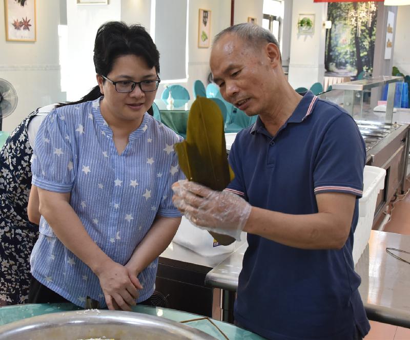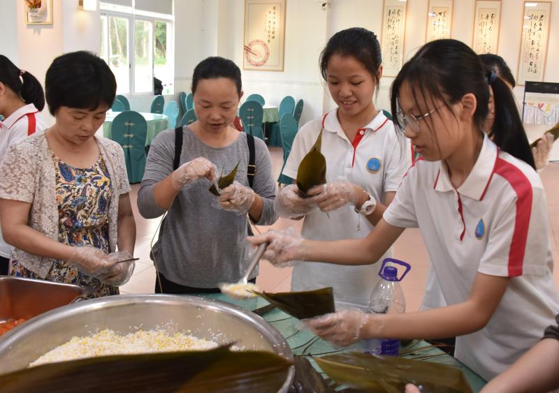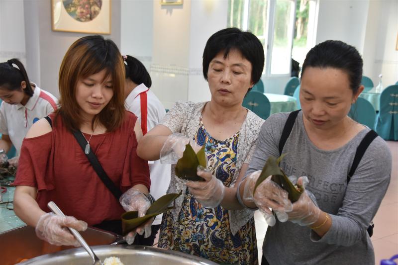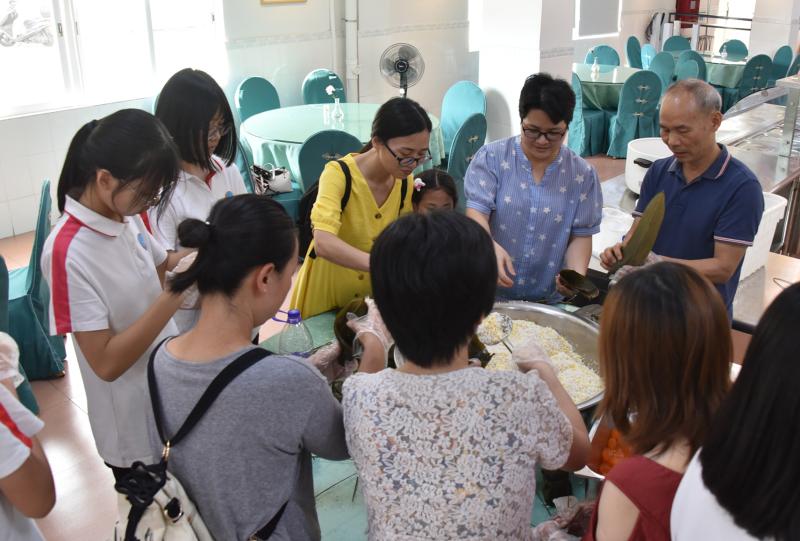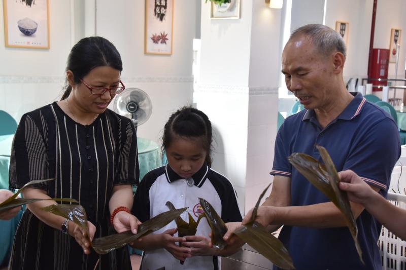 在此次活動中,以教師帶學生的方式,領(lǐng)略傳統(tǒng)粽子的做法。