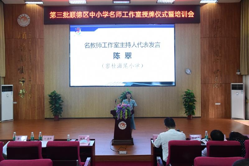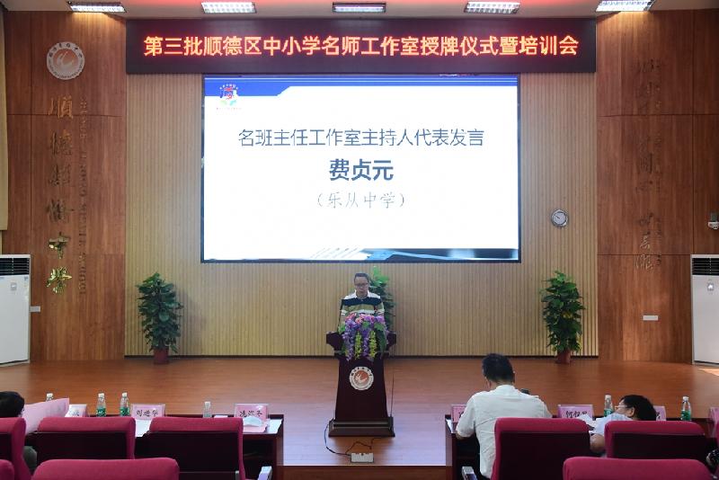 接著,華僑中學吳劍平校長代表順德區(qū)名校長工作室主持人發(fā)言,樂從中學費貞元校長代表名班主任工作室主持人發(fā)言,海尾小學陳翠校長代表名教師工作室主持人發(fā)言。