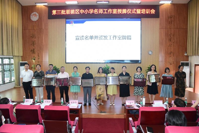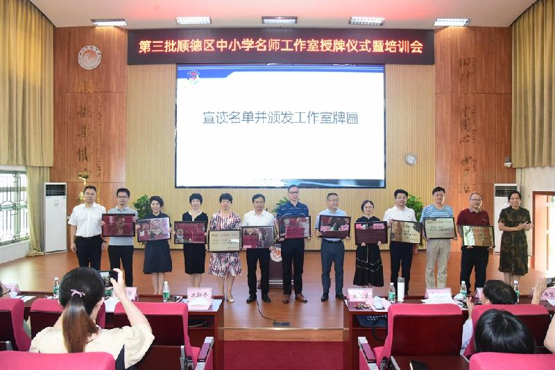 會議伊始,劉進華科長宣讀了第三批中小學名師工作室名單,順德區(qū)教育局副局長冼彌冬、教育部校長國培專家肖起清等領導、嘉賓頒發(fā)順德區(qū)中小學名師工作室牌匾以及主持人證書。經過個人申報、學校推薦和專家評審,我區(qū)成立了35個中小學名師(名校長、名班主任)工作室。其中,順德華僑中學吳劍平名校長工作室、申水源名師工作室等榜上有名,吳劍平校長、申水源副校長分別擔任這兩個工作室的首席主持人。