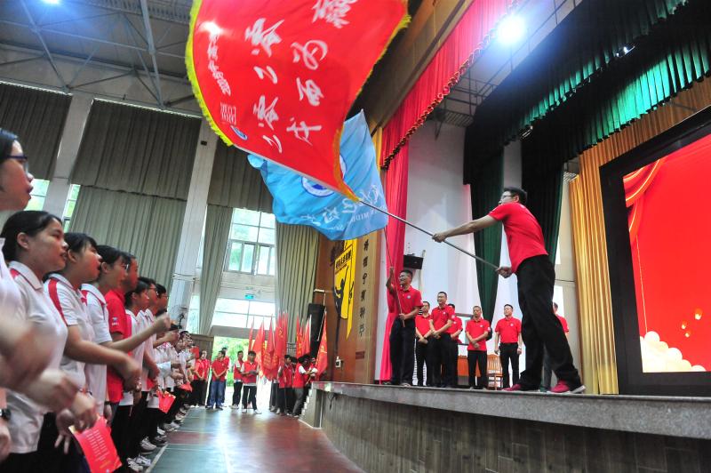 再授戰(zhàn)旗――羅桂根校長為高三年級丘建龍主任授戰(zhàn)旗,張超副校長為唐曉文副主任授校旗,丘主任為閆志才級長授戰(zhàn)旗。戰(zhàn)旗是隊伍的鋼鐵血肉,它是我們戰(zhàn)斗力量的鑄就!