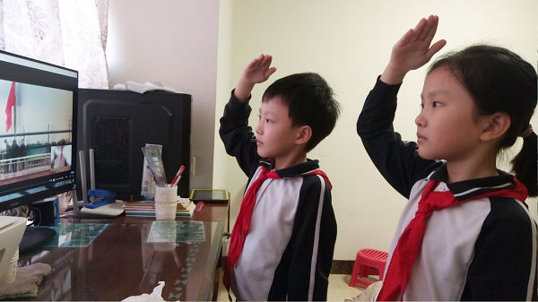 伴隨著雄渾激昂的國歌,鮮艷的五星紅旗在羅沙校園冉冉升起。升旗臺前,老師們衣著端莊,隊(duì)列整齊;電腦、手機(jī)屏幕前,師生、家長們神情莊嚴(yán)肅穆,行禮,全體同時齊唱國歌。