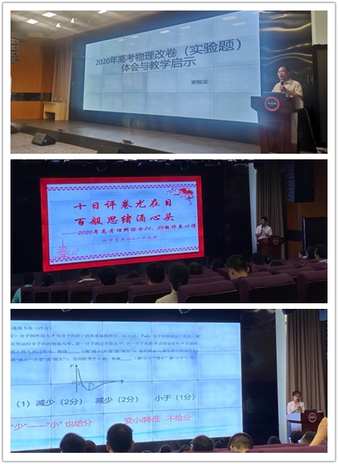 三位老師分別從2020年高考物理全國1卷的實驗題22、23題,計算題24、25題、選修題33題的改卷情況與全體教師分享交流。從解題過程到錯因分析,從得分情況到解題規(guī)范,從改卷心得到教學啟示,都做了非常詳盡的闡述,與會教師表示獲益匪淺。