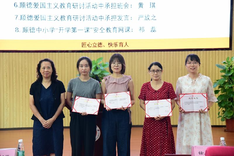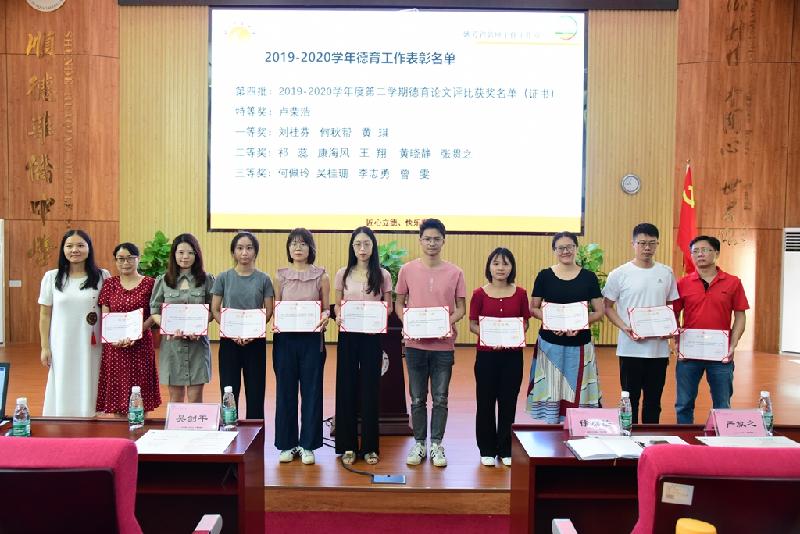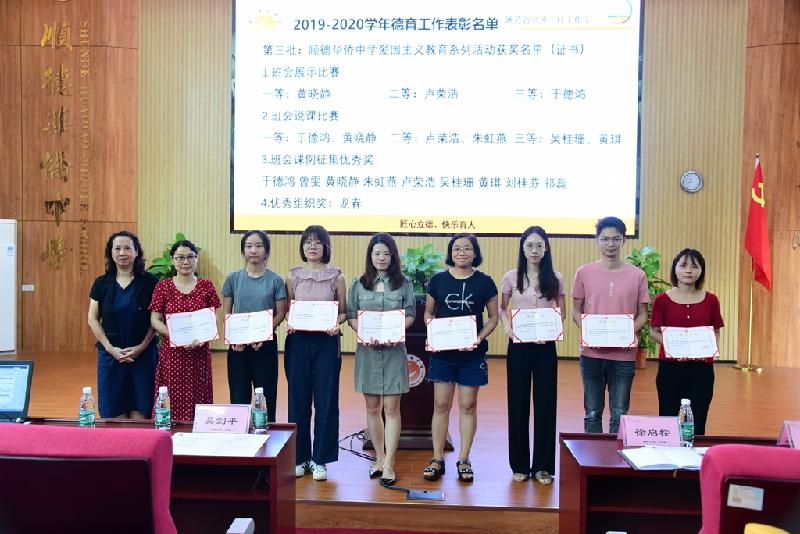 總結(jié)過后,部門對(duì)2019-2020學(xué)年表現(xiàn)特別突出的德育同仁進(jìn)行表彰和獎(jiǎng)勵(lì)。第一批頒發(fā)的是區(qū)級(jí)以上榮譽(yù)獲獎(jiǎng)?wù)撸塥?jiǎng)老師包括獲得廣東省心理健康教育成果高中組一等獎(jiǎng)的宋美丹、佛山市生命教育課例征集獲高中組特等獎(jiǎng)的黃錦銀、佛山市誠信教育課例征集獲高中組二等獎(jiǎng)的劉桂芬、班主任專業(yè)能力大賽獲順德區(qū)高中一等獎(jiǎng)的朱虹燕、順德區(qū)生涯規(guī)劃課例征集獲高中組三等獎(jiǎng)的楊嘉瑞、順德愛國主義教育研討活動(dòng)中承擔(dān)班會(huì)的黃琪、順德愛國主義教育研討活動(dòng)中承擔(dān)發(fā)言的嚴(yán)放之、承擔(dān)順德中小學(xué)“開學(xué)第一課”安全教育網(wǎng)課的祁 蕊等老師。