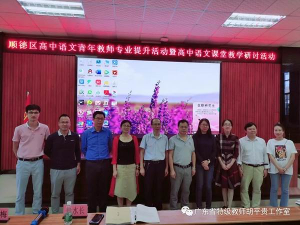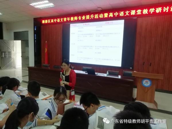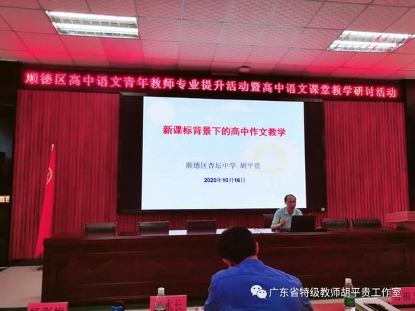 10月16日上午,由順德區(qū)胡平貴特級教師工作室和廣東省羅日明教師工作室聯(lián)合舉辦的“順德區(qū)高中語文青年教師專業(yè)提升活動暨高中語文課堂教學研討活動”在杏壇中學順利舉行,兩個工作室的部分成員以及順德區(qū)高一、高二的一百多位語文教師參加了本次活動。