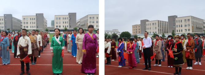 校園內(nèi)紅旗飄揚(yáng),肅穆莊嚴(yán),升旗手身穿禮服,西藏班同學(xué)身著民族服裝,在莊嚴(yán)的國歌聲中,目送著鮮艷的五星紅旗冉冉升起。